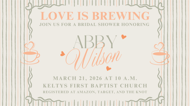 Please join us for a bridal shower honoring Abby Wilson on Saturday, March 21. It will be at 10am in the foyer. They are registered at Amazon, Target and the Knot.