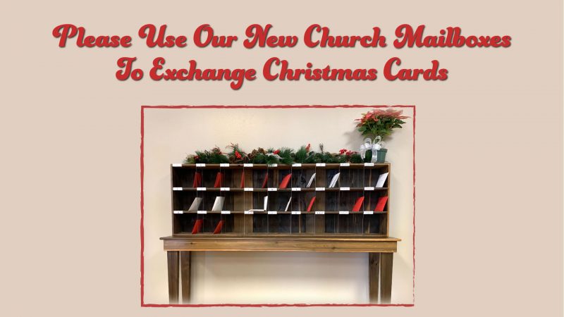 Remember to use our Christmas mailboxes located in the foyer. This is a great way to help you save time and stamps. And be sure to check the box with your last initial to see if you have received any Christmas cards!