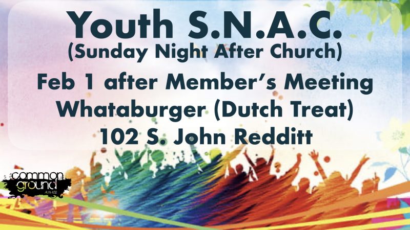 Join us next Sunday night, February 1 immediately following the members meeting! We’ll be heading to the Whataburger on the East Loop (102 S. John Redditt Dr.) for food and fellowship. Students and parents are invited. See you there!