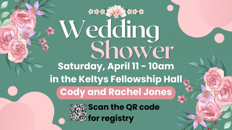 Please join us for a wedding shower honoring Cody and Rachel Jones, this Saturday, April 11. It will be at 10am in the Keltys fellowship hall. Scan the QR code for their registry.